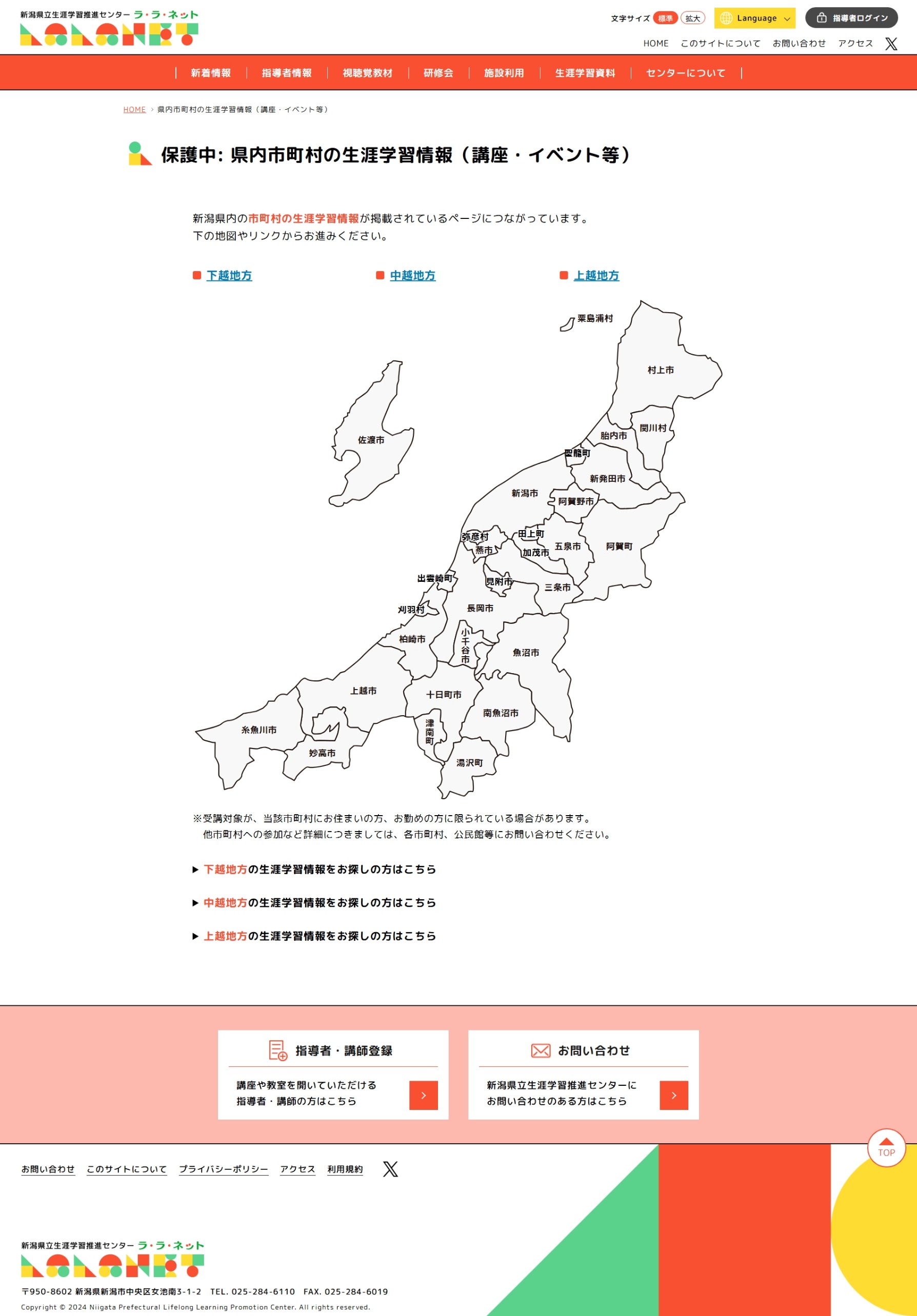 新潟県では、「だれでも、いつでも、どこでも」学べる社会の実現に向けて、生涯学習推進センターホームページ「ラ・ラ・ネット」を開設しています。「ラ・ラ・ネット」は、講座や講演会の講師・指導者を探す「指導者検索」、団体向け貸出用DVDなどの「視聴覚教材検索」の機能のほか、センターで行う研修会や生涯学習にかかわる情報を発信しています。