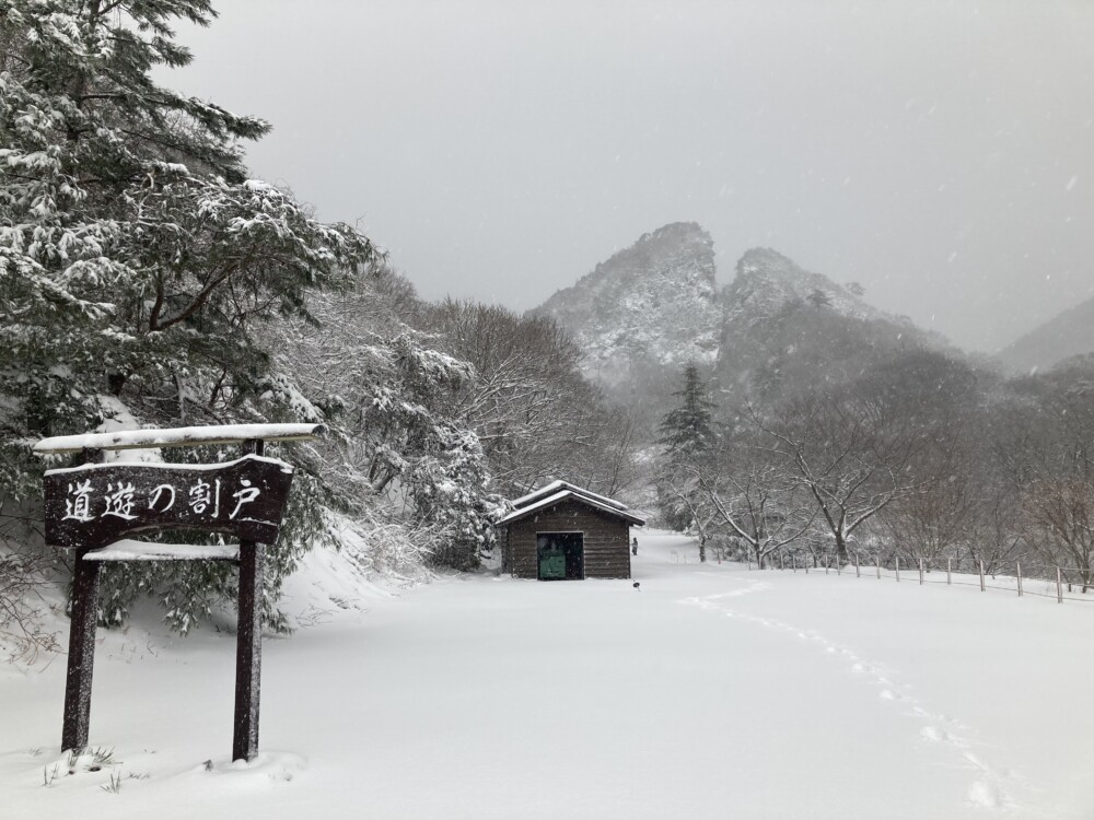 雪化粧した道遊の割戸(どうゆうのわりと)