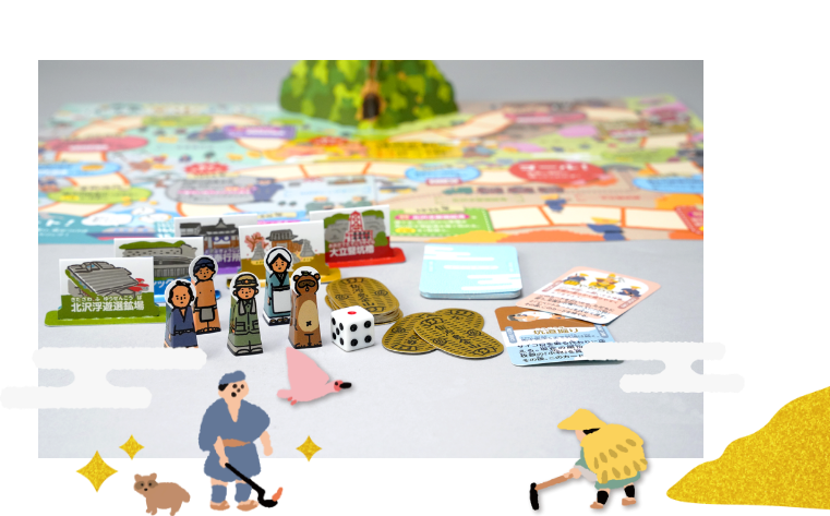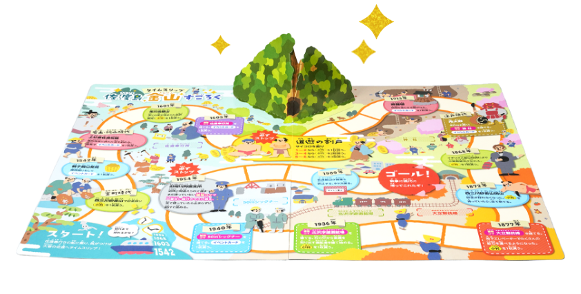 遊びながら佐渡金銀山が発展してきた歴史を楽しく学べるすごろくです。コマを進めるごとに時代が進み、史実に関連したイベントが発生したり、歴史的建造物を建てたりしながらゴールを目指します。