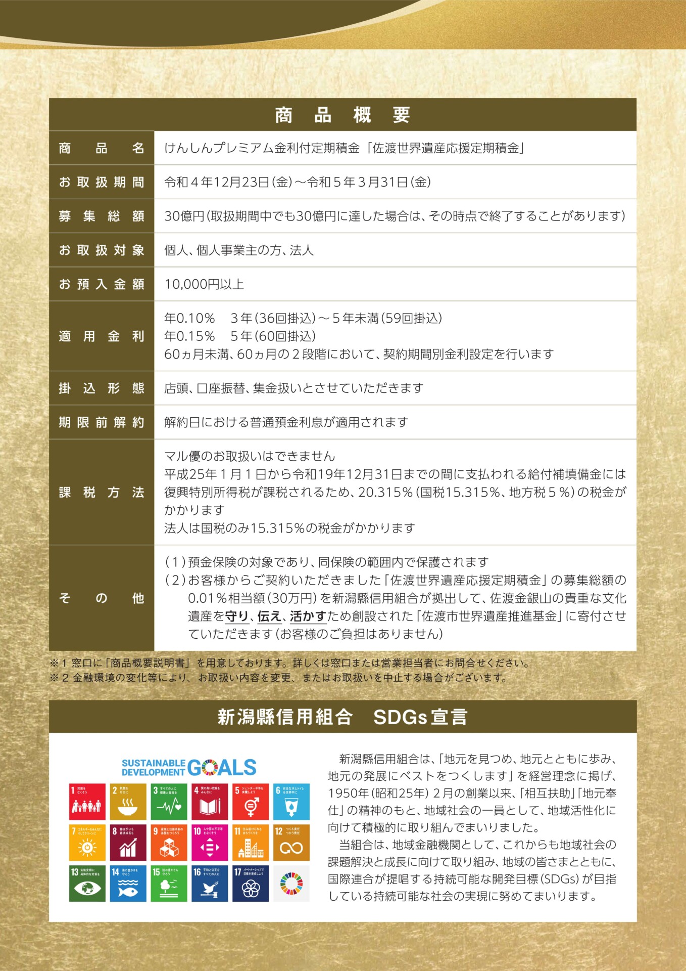 どなたでもご利用いただけるプレミアム金利付定期積金です。募集総額の0.01%相当額を新潟縣信用組合が拠出し、佐渡市世界遺産推進基金に寄付します。