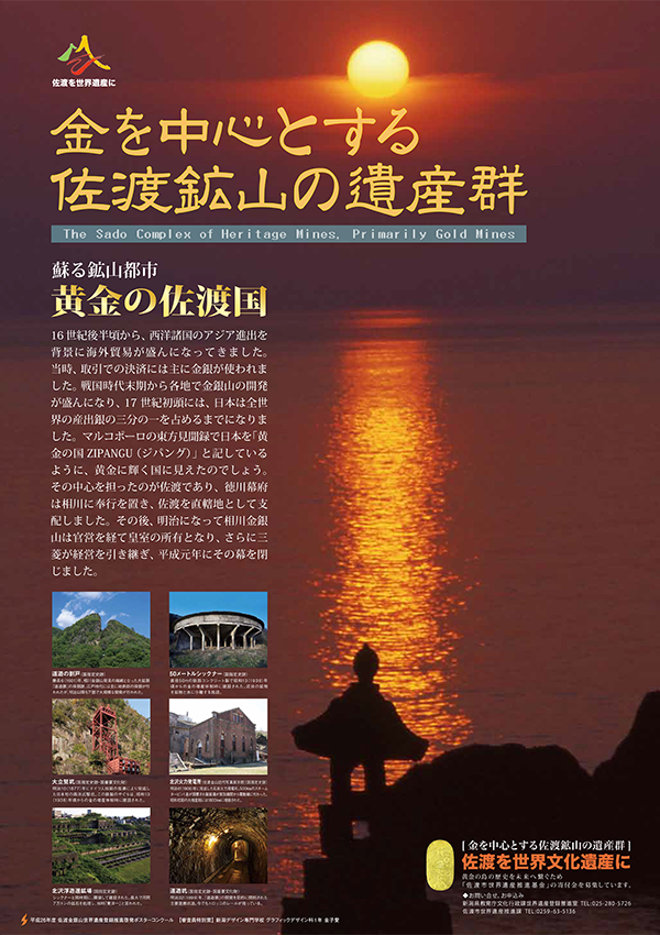 平成26年度に開催した「佐渡金銀山世界遺産登録啓発ポスターコンクール※」の優秀作品を基に、制作した世界遺産登録を目指す佐渡金銀山の啓発ポスターです。