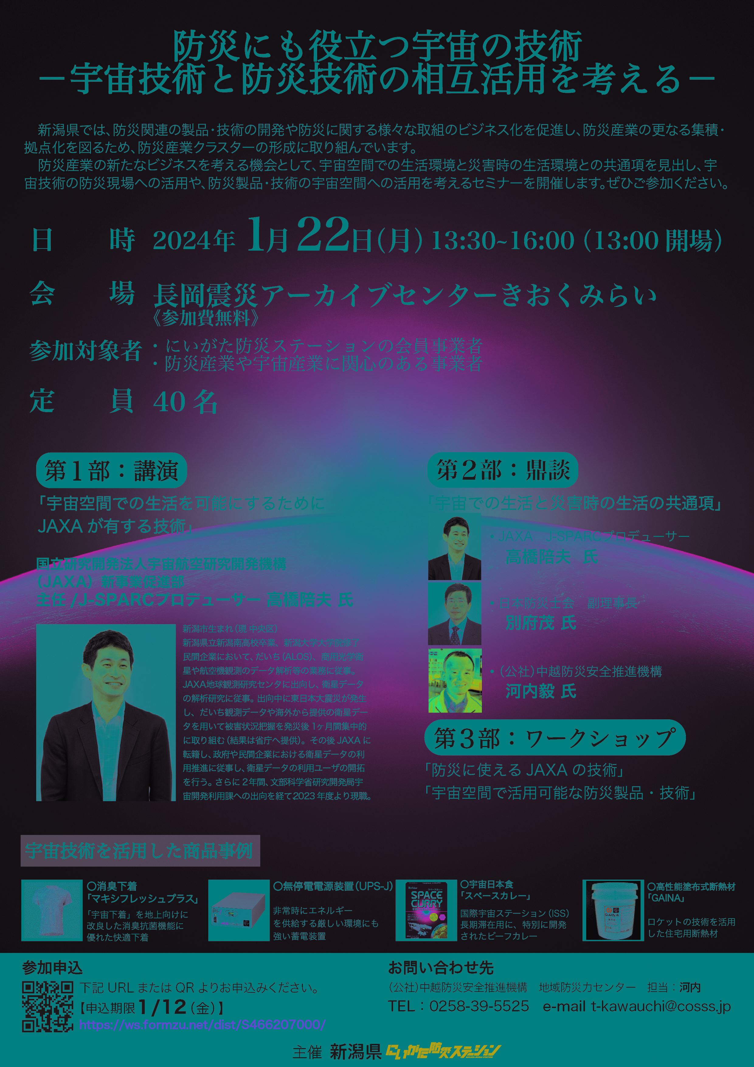 この度、防災産業の新たなビジネスを考える機会として、宇宙空間での生活環境と災害時の生活環境との共通項を見出し、宇宙技術の防災現場への活用や、防災製品・技術の宇宙空間への活用を考えるセミナーを下記のとおり開催します。